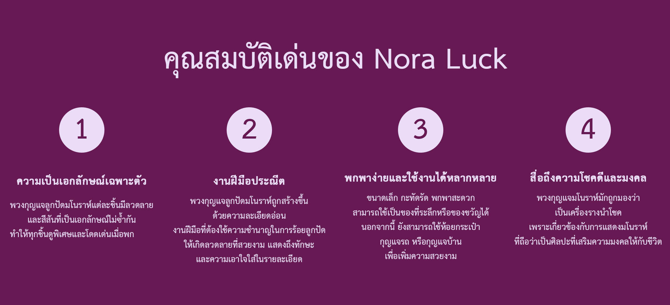 Nora Luck ร้านพวงกุญแจจากลูกปัดมโนราห์ จัดจำหน่ายสินค้าหัตถกรรมที่มีเอกลักษณ์เฉพาะตัว โดยใช้ลูกปัดเป็นวัสดุหลักในการประดิษฐ์ผลิตภัณฑ์ รูปแบบการออกแบบสินค้าของร้านนี้ได้รับแรงบันดาลใจจากศิลปะการแสดงมโนราห์ ซึ่งเป็นศิลปวัฒนธรรมพื้นบ้านที่มีชื่อเสียงในภาคใต้ การประดิษฐ์พวงกุญแจจากลูกปัดมโนราห์นี้เป็นการผสมผสานระหว่างความเป็นศิลปะพื้นบ้านกับงานฝีมือร่วมสมัย ทำให้สินค้าดูน่ารักและมีความหมายที่ลึกซึ้ง
